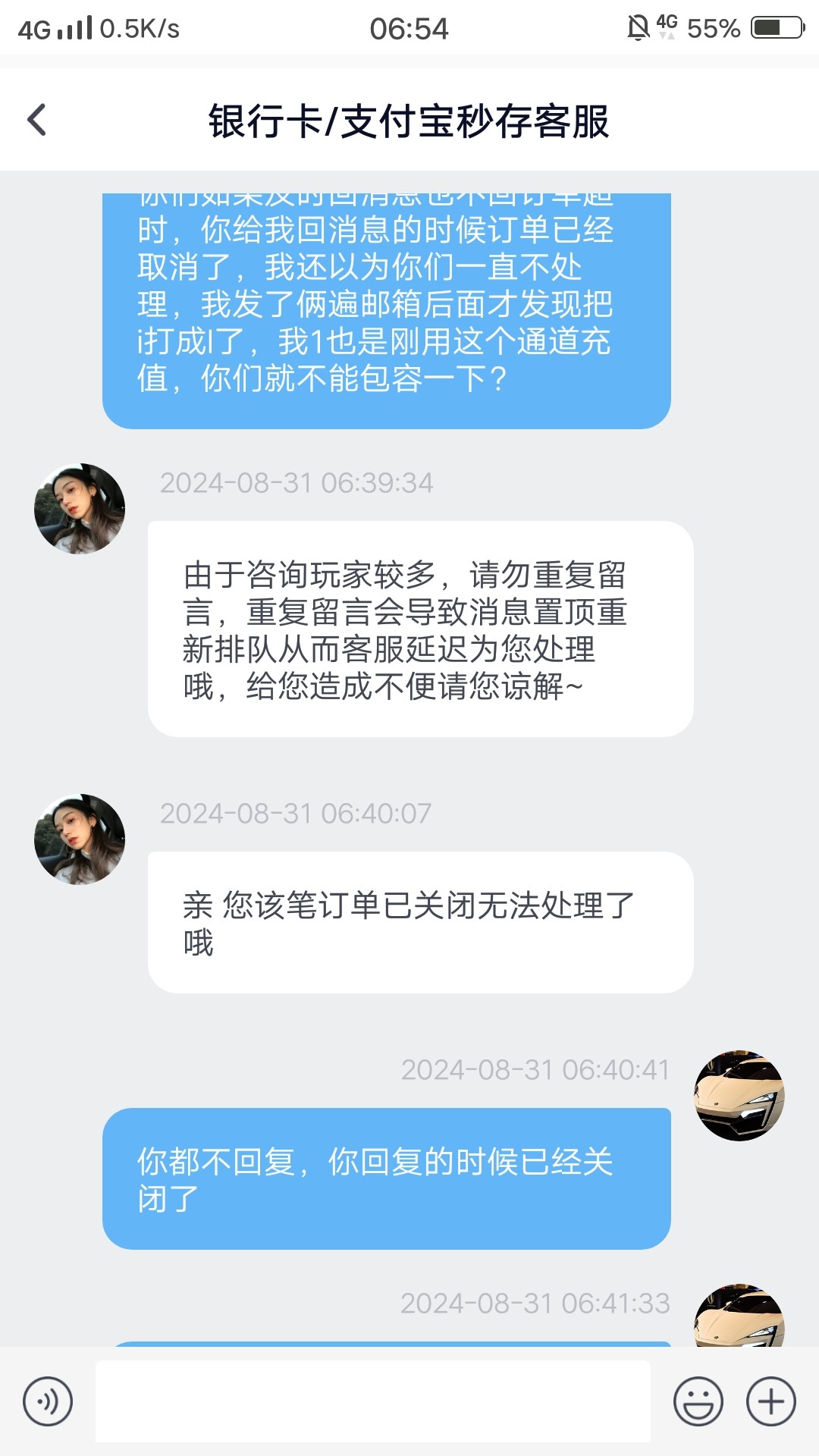 充值的时候一直不回消息等支付完成过后不回消息,等订单结束过后就回我了,蛋蛋这个能帮忙处理一下吗?过的以前那个老哥白菜网链接