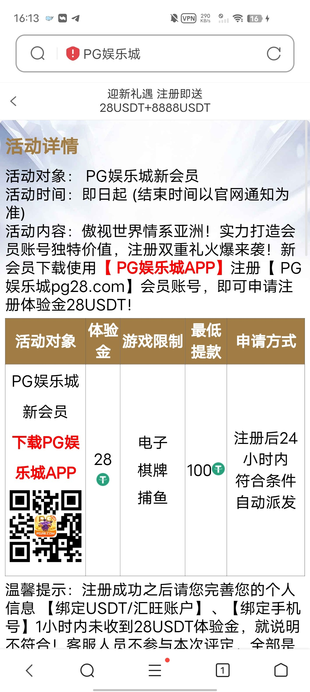 活动一: 新用户注册绑手机号和usdt地址 一小时内自动赠送28usdt 没送就是不符合具体自测  游戏和提款限制自行查看优惠