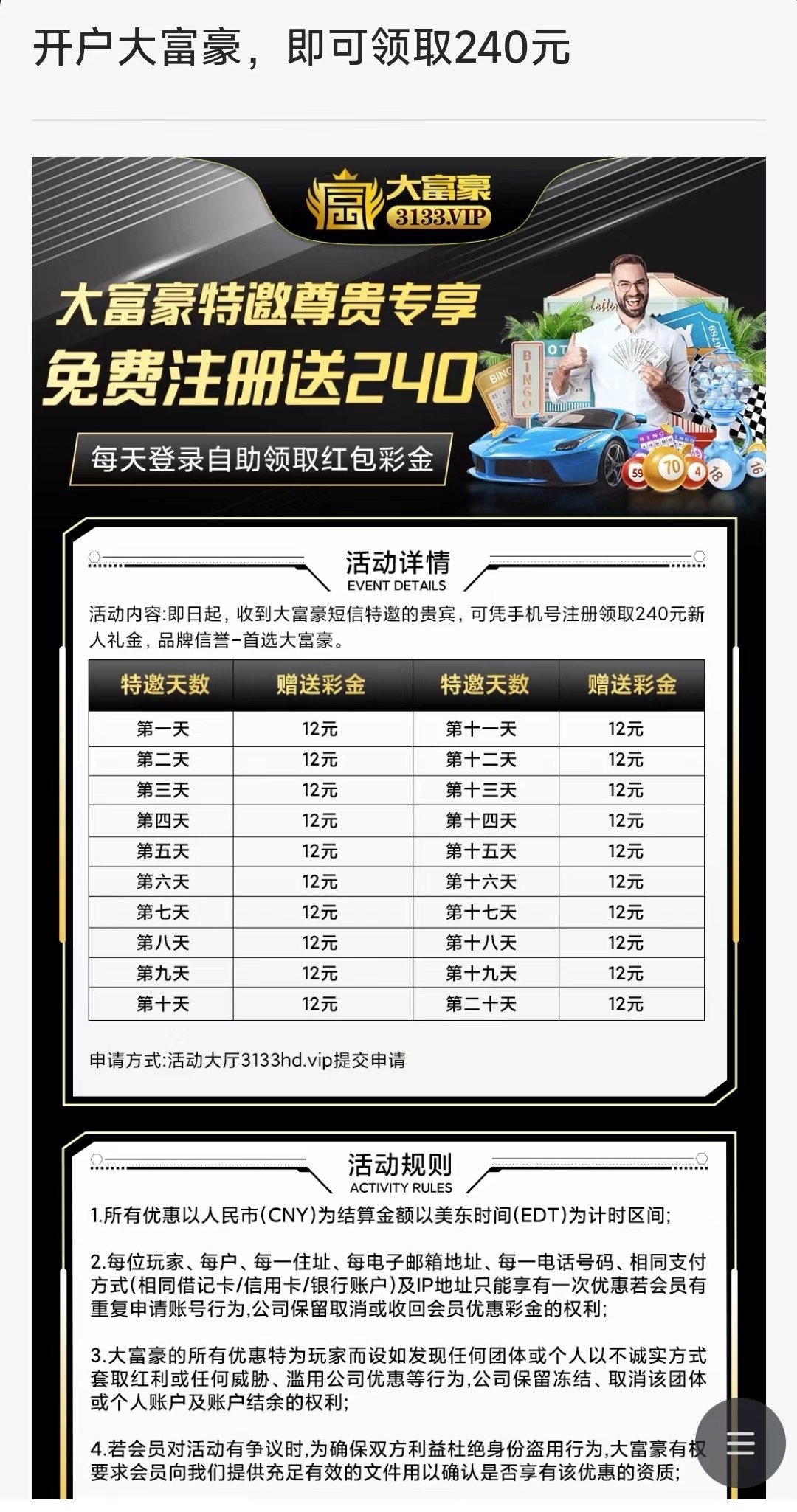 本站声明 1、本帖标题:【大富豪3133】——(送240)
