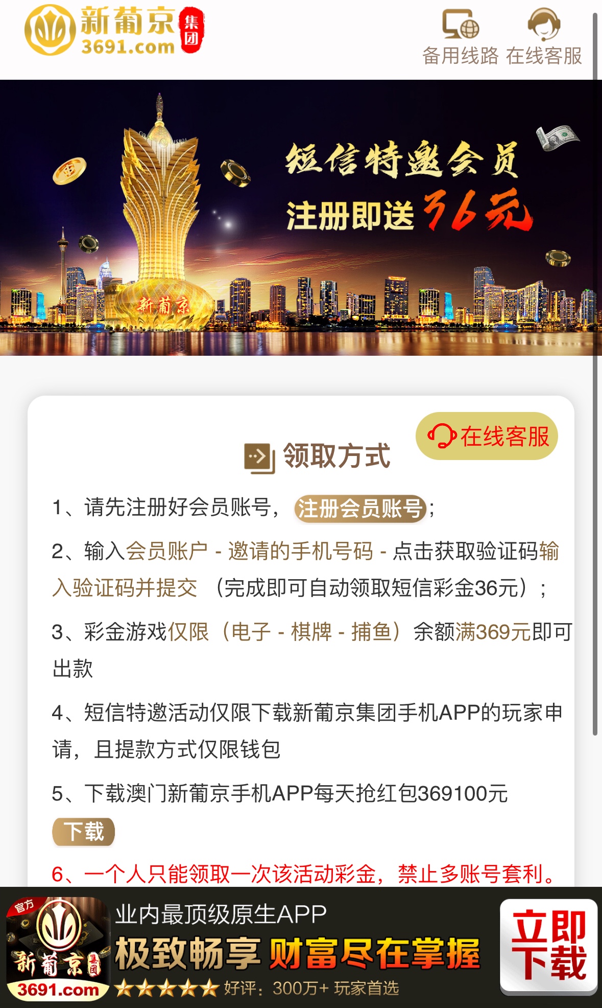 可以先去链接里的自助领取彩金,输入手机号获取验证码,看看能不能收到验证码,能收到说明可以领,之后再注册领取。收不到无视即可。希望老哥多多分享本站,叫上朋友一起撸。