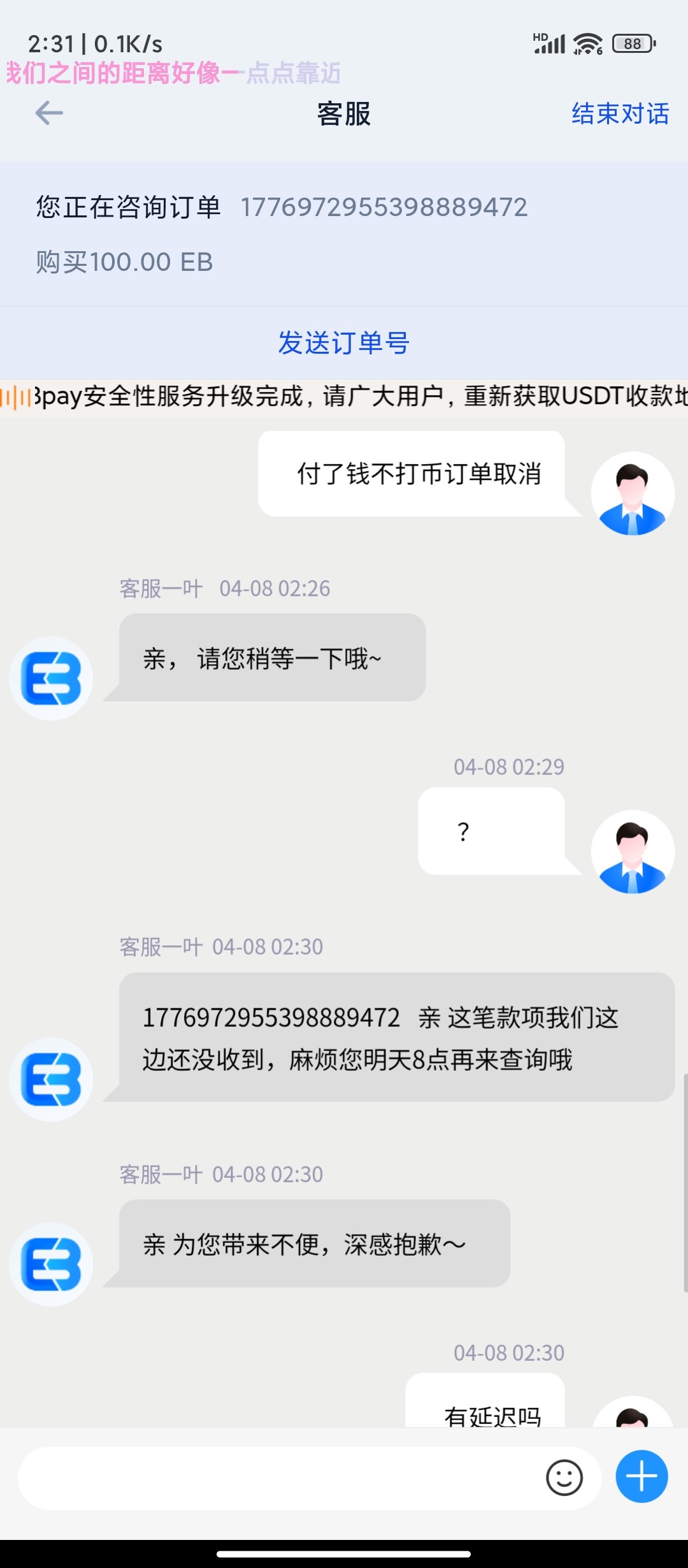 操他妈的 对方不放币  还取消订单了  客服来一句没收到 明天8点10再查询  傻逼玩意