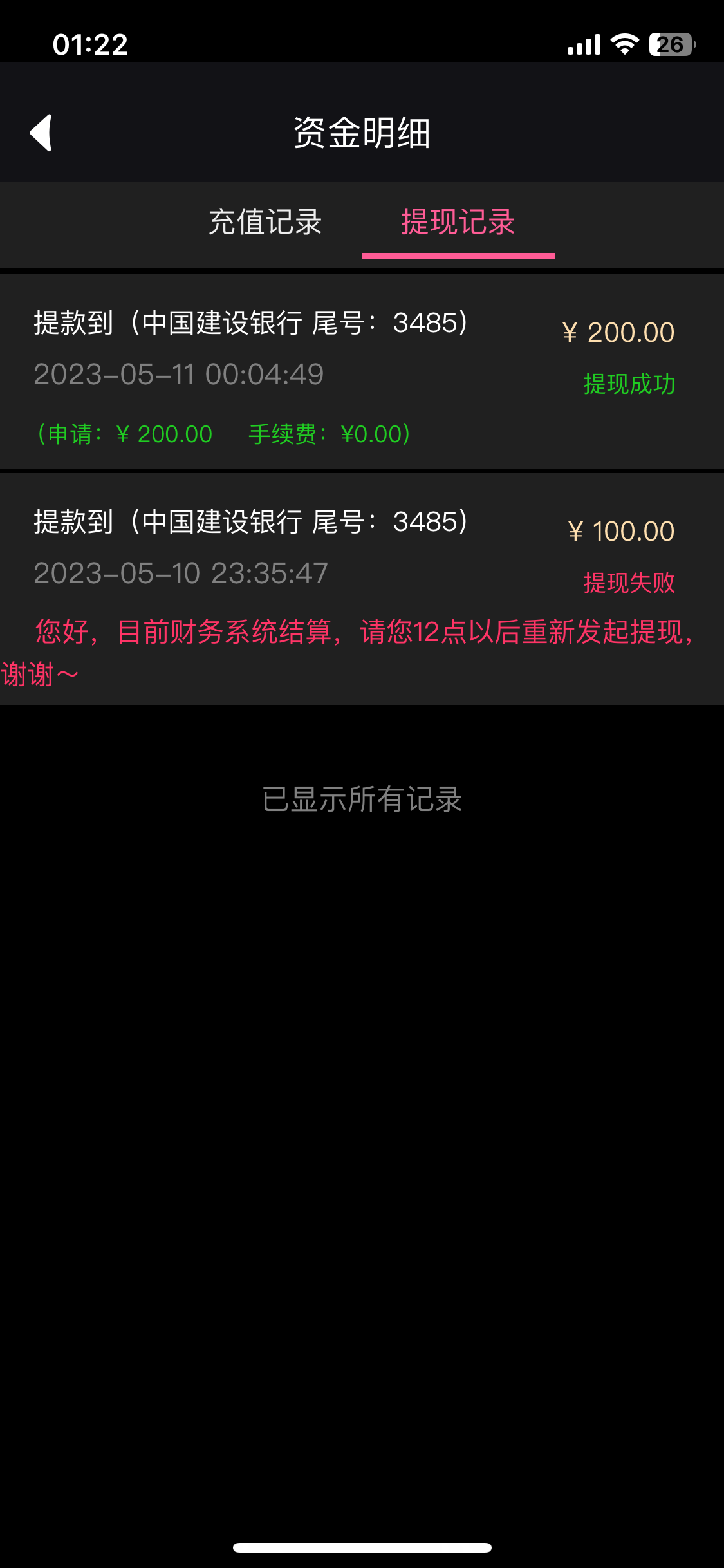 提了100半小时没到账