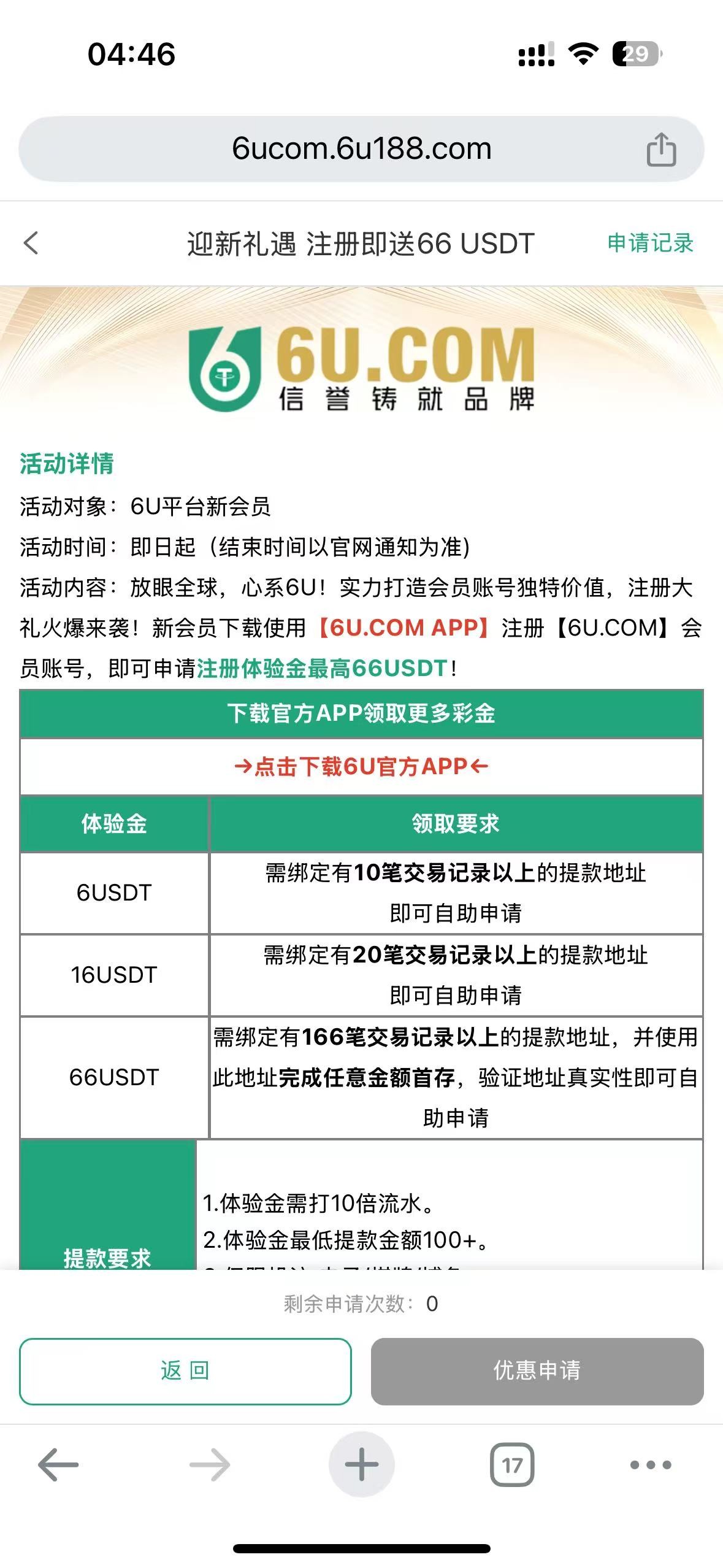 注册的时候选择U版本 绑定活跃地址,可以免费申请6-66U 提现到了