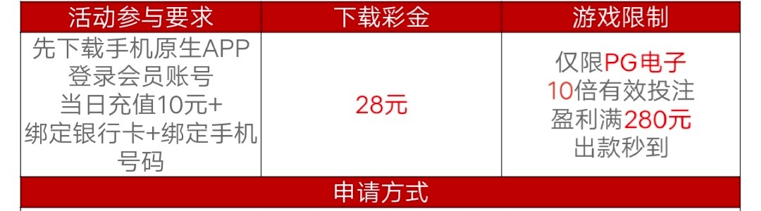 首存20送20,5倍流水钱能出款,打完以后可以申请下载APP28彩金,相当于38+40+28,没有特邀的话也有68,APP彩金申请一定要下载原生APP”并在48小时”之内申请,否则不予通过,具体介绍看活动介绍。还有这个台有以小博大和三场红包雨,可以去试一试,充值小搏就好,不要大额充值,出款自测。