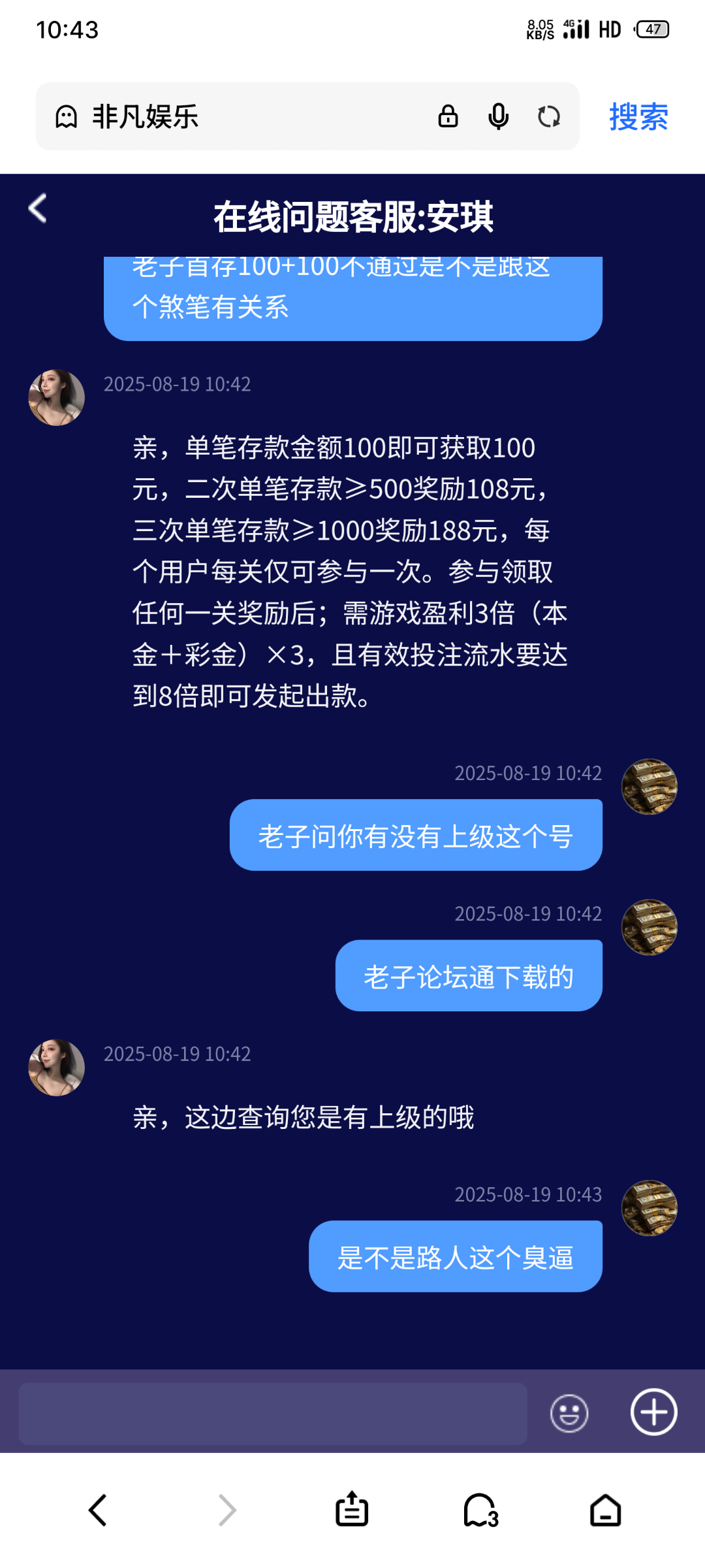 你妈的非凡走你链接申请首存都通不过,谁敢当你下级,老子都忘了一号重新注册了一遍