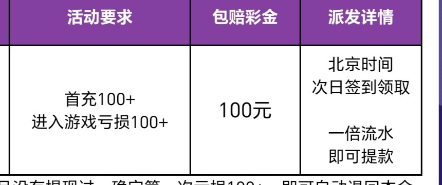 你看这个玩吗,这个台有个包赔100,如果充100亏损,第二天领取100,一杯水提