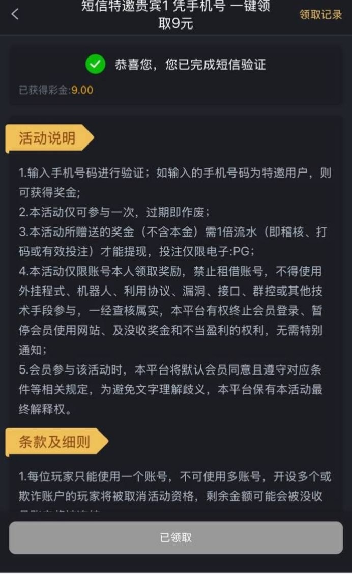新用户注册绑定好信息优惠里面自助申请特邀9彩金,具体自测吧