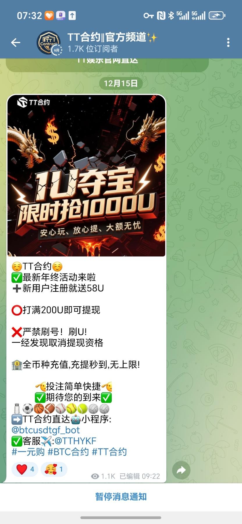 白嫖即可,关注飞机频道@TTHYGP,进去秒领取58u,说是到200u提,我到100u死了,打出来的团一个,人多必黄!
