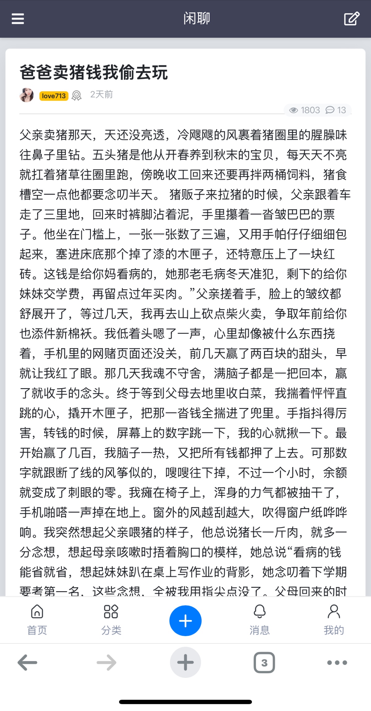 父亲卖猪那天,天还没亮透,冷飕飕的风裹着猪圈里的腥臊味往鼻子里钻。五头猪是他从开春养到秋末的宝贝,每天天不亮就扛着猪草往圈里跑,傍晚收工回来还要再拌两桶饲料,猪食槽空一点他都要念叨半天。 猪贩子来拉猪的时候,父亲跟着车走了三里地,回来时裤脚沾着泥,手里攥着一沓皱巴巴的票子。他坐在门槛上,一张一张数了三遍,又用手帕仔仔细细包起来,塞进床底那个掉了漆的木匣子,还特意压上了一块红砖。这钱是给你妈看病的,她那老毛病冬天准犯,剩下的给你妹妹交学费,再留点过年买肉。”父亲搓着手,脸上的皱纹都舒展开了,等过几天,我再去山上砍点柴火卖,争取年前给你也添件新棉袄。我低着头嗯了一声,心里却像被什么东西挠着,手机里的网赌页面还没关,前几天赢了两百块的甜头,早就让我红了眼。那几天我魂不守舍,满脑子都是一把回本,赢了就收手的念头。终于等到父母去地里收白菜,我揣着怦怦直跳的心,撬开木匣子,把那一沓钱全揣进了兜里。手指抖得厉害,转钱的时候,屏幕上的数字跳一下,我的心就揪一下。最开始赢了几百,我脑子一热,又把所有钱都押了上去。可那数字就跟断了线的风筝似的,嗖嗖往下掉,不过一个小时,余额就变成了刺眼的零。我瘫在椅子上,浑身的力气都被抽干了,手机啪嗒一声掉在地上。窗外的风越刮越大,吹得窗户纸哗哗响。我突然想起父亲喂猪的样子,他总说猪长一斤肉,就多一分念想,想起母亲咳嗽时捂着胸口的模样,她总说“看病的钱能省就省,想起妹妹趴在桌上写作业的背影,她念叨着下学期要考第一名,这些念想,全被我用指尖点没了。父母回来的时候,天已经黑透了。父亲习惯性地去摸床底的木匣子,手伸进去的那一刻,他的动作僵住了。他转过头看我,眼神里没有愤怒,只有茫然和一点点不敢置信,那目光比刀子还锋利,割得我心口生疼。母亲也凑过来,看见空匣子,腿一软,差点坐在地上。钱呢?父亲的声音哑得厉害,像被砂纸磨过。我张了张嘴,喉咙里堵得发慌,一个字也说不出来。眼泪砸在地上,溅起细小的泥点。父亲没再问,只是蹲在门槛上,一支接一支地抽着旱烟,烟雾缭绕中,我看见他的肩膀在微微发抖。夜里,我躺在床上,翻来覆去睡不着。隔壁传来母亲压抑的啜泣声,还有父亲一声接一声的叹息。窗外的月亮冷冷的,我攥着空空的口袋,恨不得扇自己两个耳光。那五头猪,是父亲大半年的血汗;那沓钱,是这个家沉甸甸的盼头。而我,却把这些,全都输在了一场荒唐的网赌里,输得干干净净,连一点念想都没剩下。
