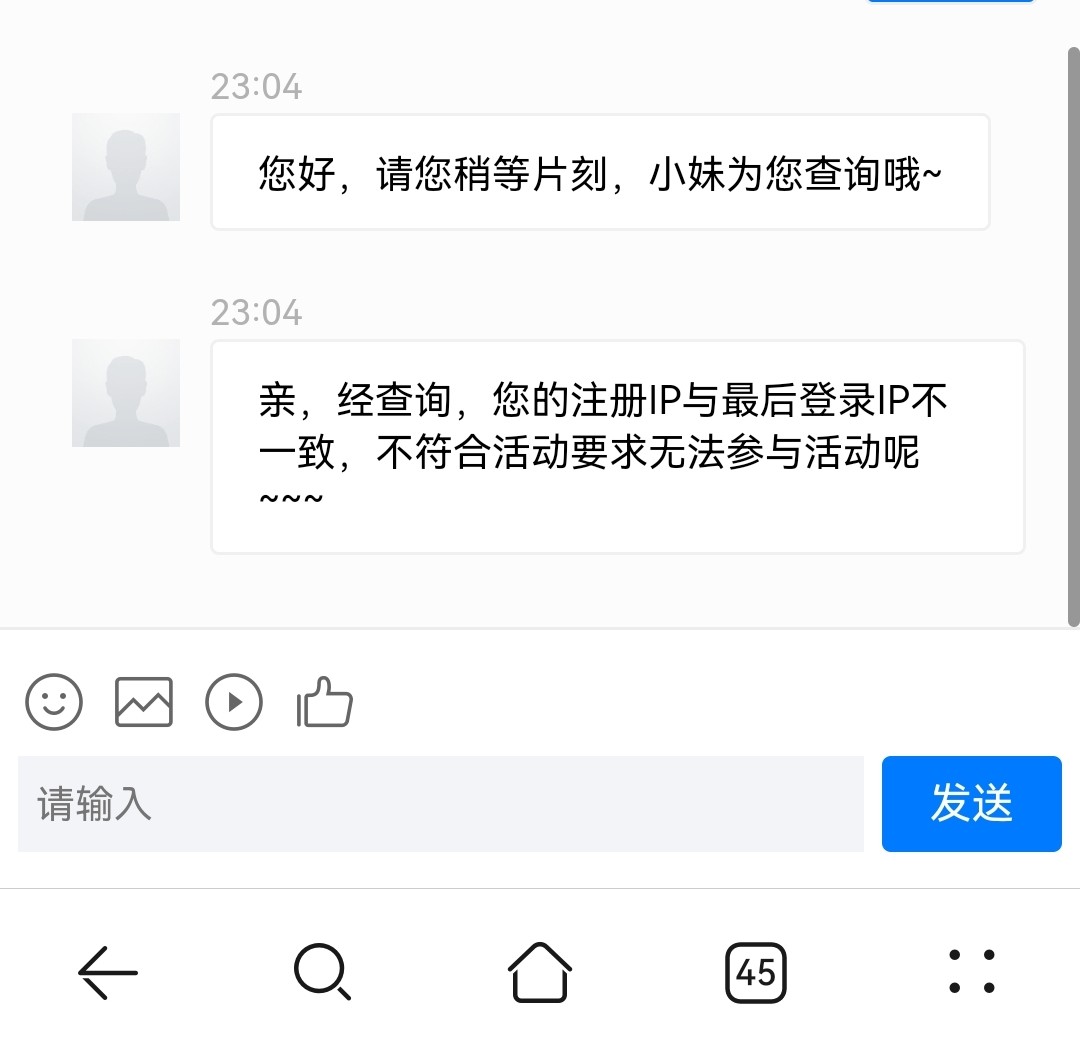 云南 10:04 亲,经查询,您的注册IP与最后登录IP不一致,不符合活动要求无法参与活动呢~~~
